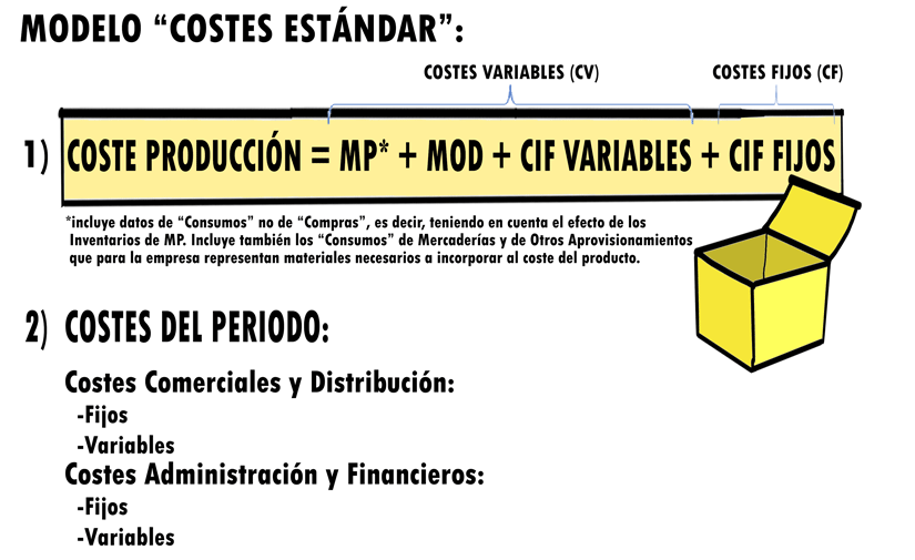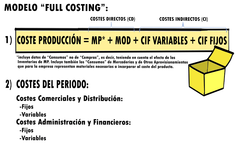 Por tanto, el «coste del producto» está formado por Materia Prima (MP) + Mano de Obra Directa (MOD) + Costes Indirectos de Fabricación Variables y Fijos (CIF Variables + CIF Fijos).